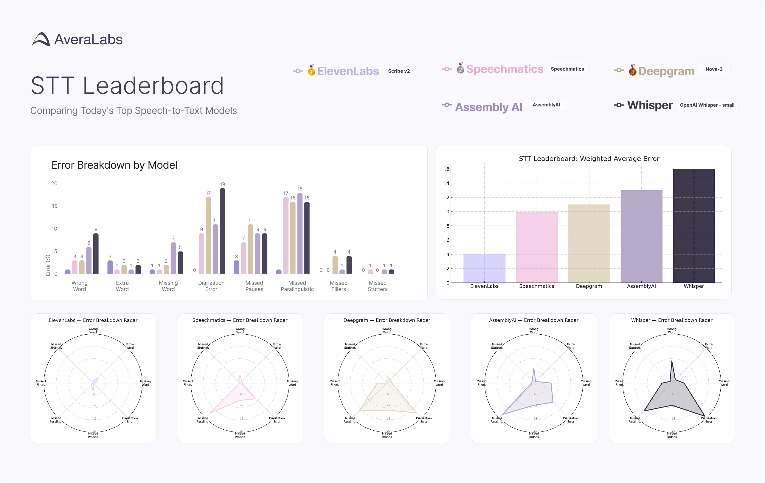 This leaderboard is based on manual annotation of real-world audio files. Each file reflects a different context and speaking environment — including noisy phone lines, fast talkers, accents, interruptions, and multi-speaker turn-taking.
